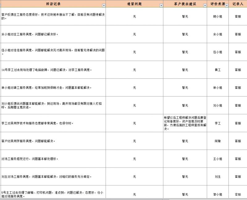 目前,客户部已抽调了28家客户对接人,对7位一线技术工程师的技术能力、服务态度、准点情况等方面进行了全方位的了解,由于篇幅有限,以下仅为部分访问调查记录截图。
